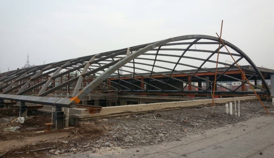 該項(xiàng)目為舊建筑改建工程,跨度18.9米,原結(jié)構(gòu)未考慮增加采光頂后產(chǎn)生水平力,我司采用交叉位置剛性節(jié)點(diǎn),反起拱,工廠拼裝實(shí)驗(yàn),再結(jié)合各種工況下計(jì)算,單側(cè)采用滑移支座,無(wú)論是從受力還是施工周期上都得到保障,為后續(xù)曲面空間結(jié)構(gòu)積累經(jīng)驗(yàn)。