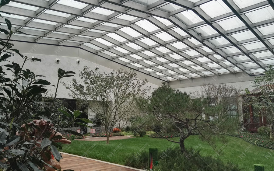 京東新總部大樓位于北京市亦莊經(jīng)濟(jì)開發(fā)區(qū),河北粵華裝飾承建頂樓四合院兩項開合屋頂系統(tǒng)??砷_合陽光采光頂保障了四合院中泳池及空中花園對天氣變化的應(yīng)對。